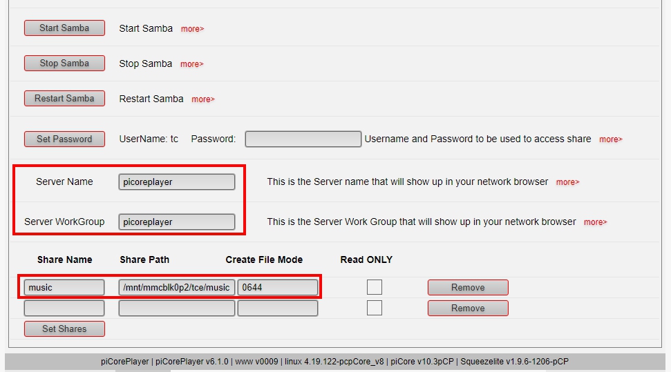你也可以在PiCorePlayer裡面安裝Samba共用資料夾,這樣就可以把檔案丟進去了。注意:密碼要先設定好資料夾,啟動Smba之後才能改。