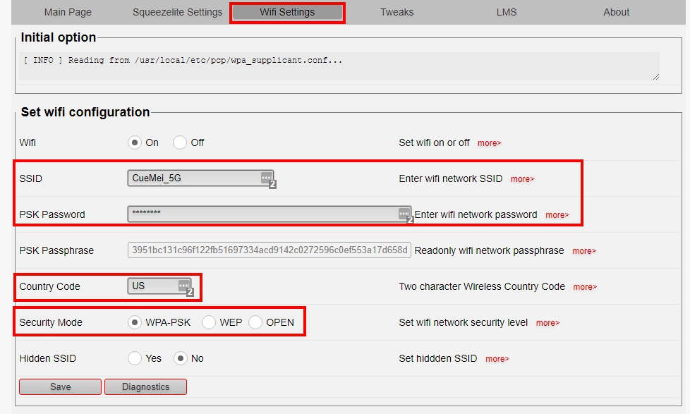 設定PiCorePlayer連接家裡的Wifi,這個階段設定好就可以擺脫網路線了,由於我用的是Raspberry Pi4B+,它有支援5G Wifi網路,但是無法連線,搜尋不到我家裡的5G Wifi,所以我剛開始都使用2.4G Wifi,後來靈機一動會不會是Country Code(國碼)問題,改成[US]就可以順利連接了,原本填[TW]無法連5G Wifi。(這個也很關鍵,試了好久才發現,網路上似乎也沒人提到過)