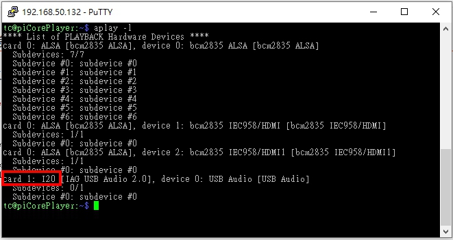 音效卡名稱查詢方法,把插上USB Audio之後,登入SSH,指令[aplay -l],就可以看到現在的USB Audio型號了。如下圖,我的是音效卡是CARD I20,因此就是I20了。