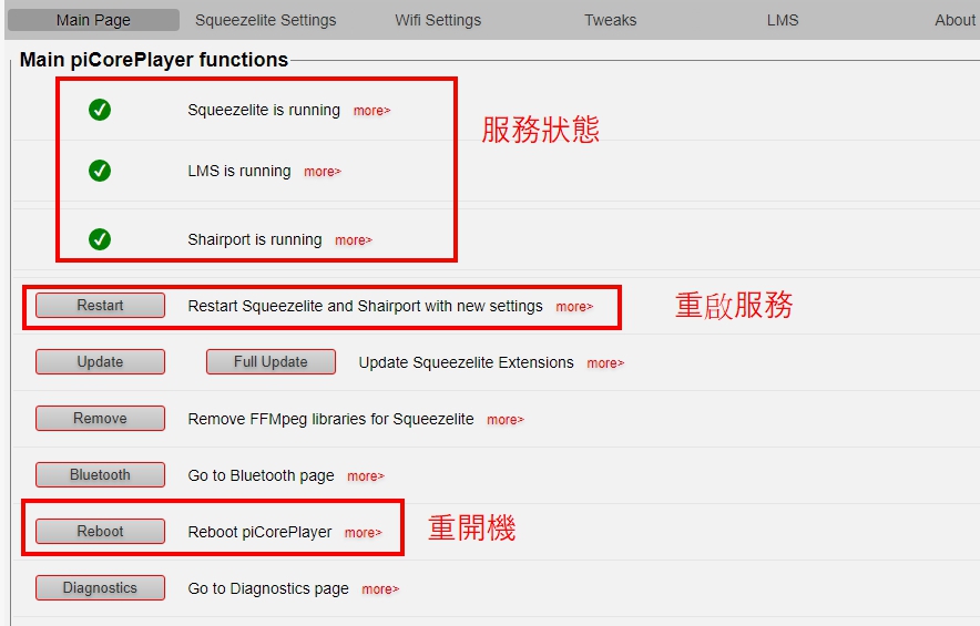 上面講的都好了之後,基本上你的PiCorePlayer就設定完成了,可以從Main Page看到現在的服務狀態,也可能從這邊重開服務、重開機。