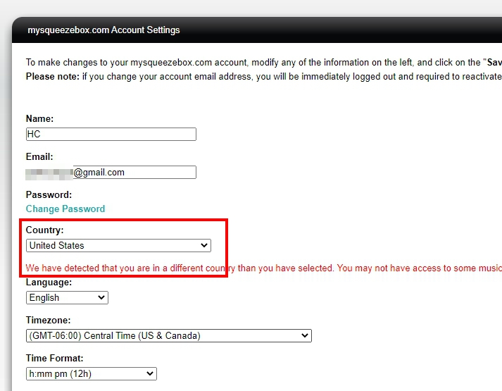 它下面會寫[We have detected that you are in a different country than you have selected. You may not have access to some music services.],不必理它,使用上不影響。