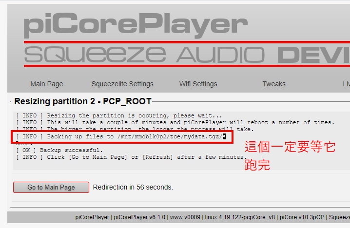 最後如果你懂Linux,你可能會SSH進後台,把音樂存在SD卡內,但是PiCorePlayer備份會把一些資料夾包進去,如果你在這些資料夾存音樂,這樣備份速度就會超慢。注意:如果他還沒備份完,你就執行其他動作,系統會崩潰,無法開機變磚頭!一開始我都把音樂放在/home/tc裡面,因為我沒耐心,每次存檔都沒等備份跑完,就按上一頁執行其他指令,導致經常壞掉,重灌SD卡好幾次,後來學聰明把資料放在/mnt/mmcblk0p2/tce/music。