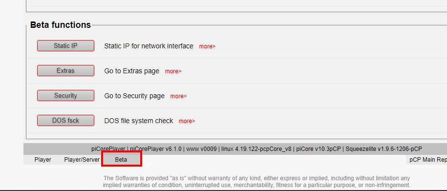 瀏覽器輸入IP就可以進入PiCorePlayer管理頁面,我選擇Beta版本(Main Page頁拉到最下面)。
