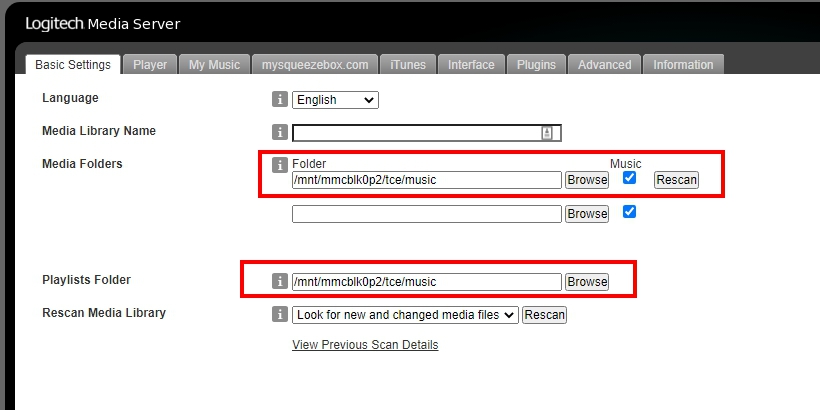 可以把你設定\掛載的目錄帶進來,先Apply再Rescan,就可以再LMS(Logitech Media Server)的介面找到你的音樂了。