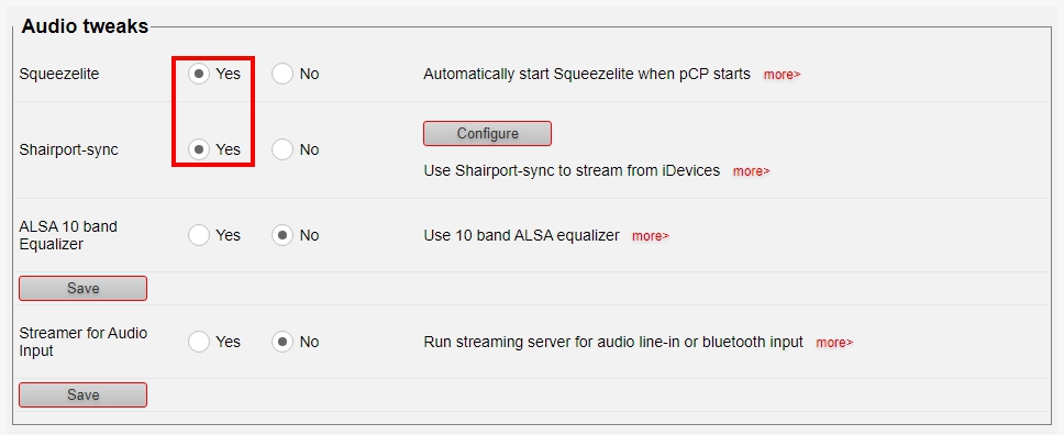 Audio tweaks,Squeezelite、Shairport-sync選Yes就好,其他沒用到就選No