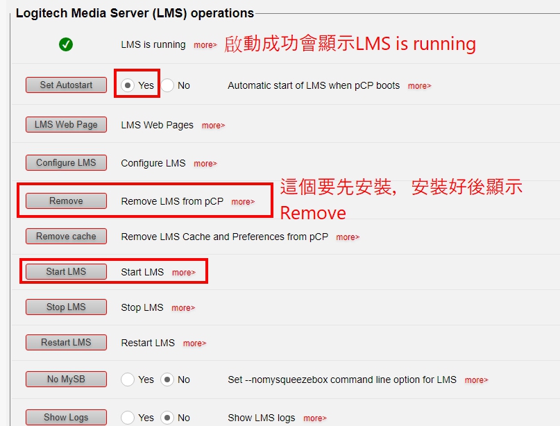 LMS(Logitech Media Server)設定,必須先點選Install LMS Cache and Preferences from pCP,然後啟動它(Start LMS)。