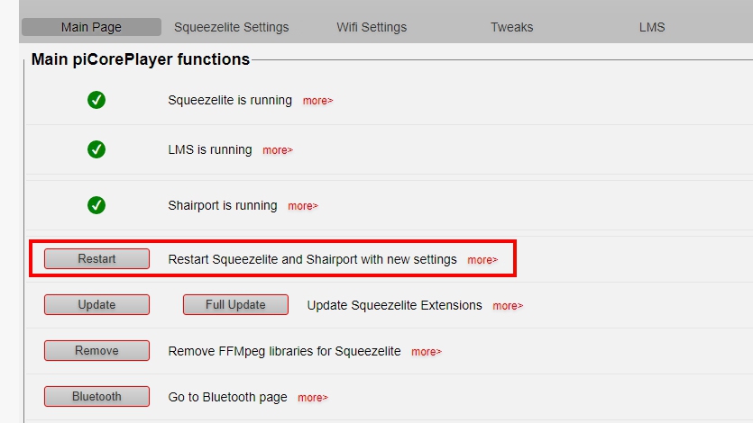 Most of PiCorePlayer is runs 24 hours a day, so it cannot be turned on/off at the same time as the amplifier/dac. When the amplifier/dac is turned off, the USB Audio will be disconnected, but when the amplifier/dac is turned on again, Squeezelite will not automatically reconnect the USB Audio. You must restart the service on the PiCorePlayer interface to continue the connection. Really troublesome.