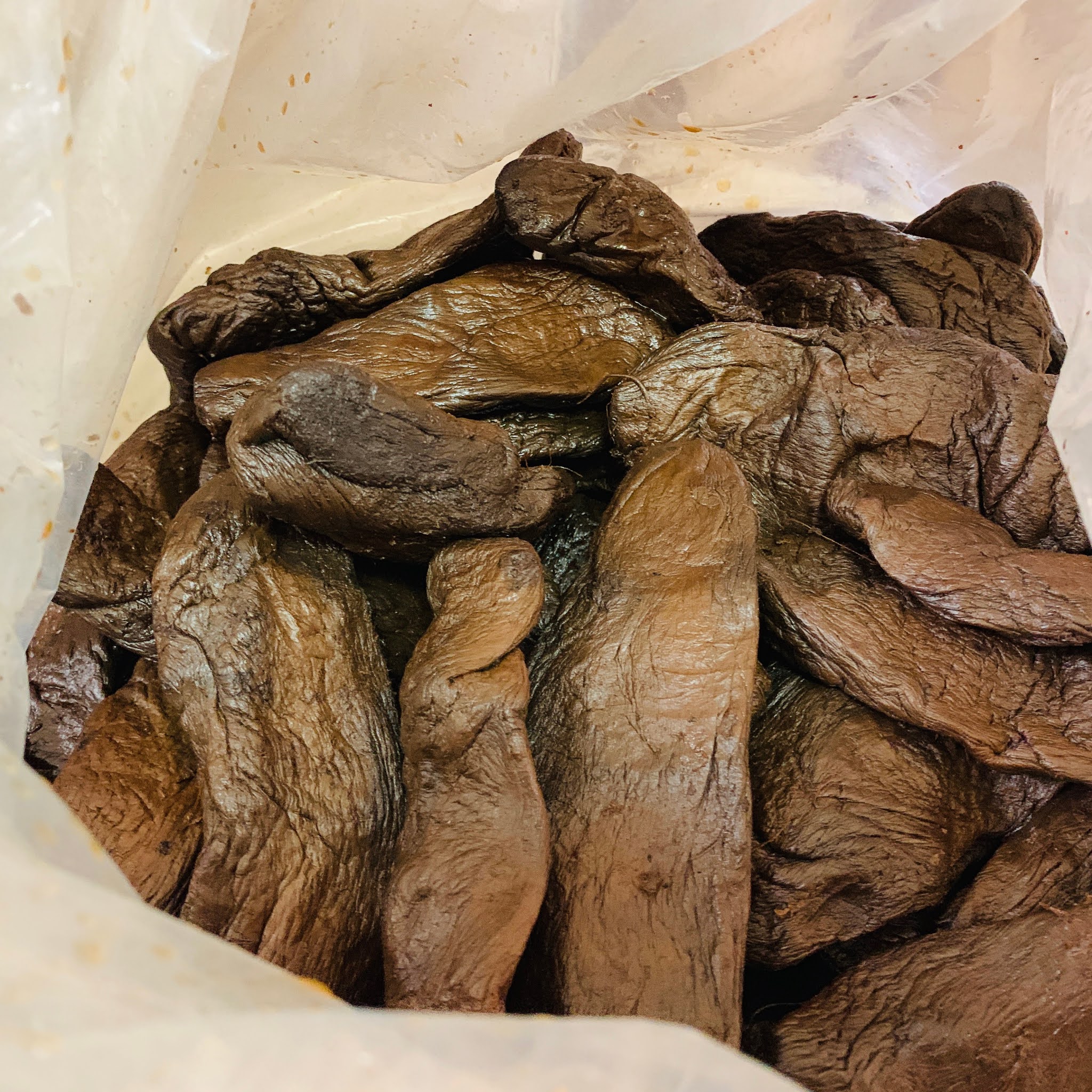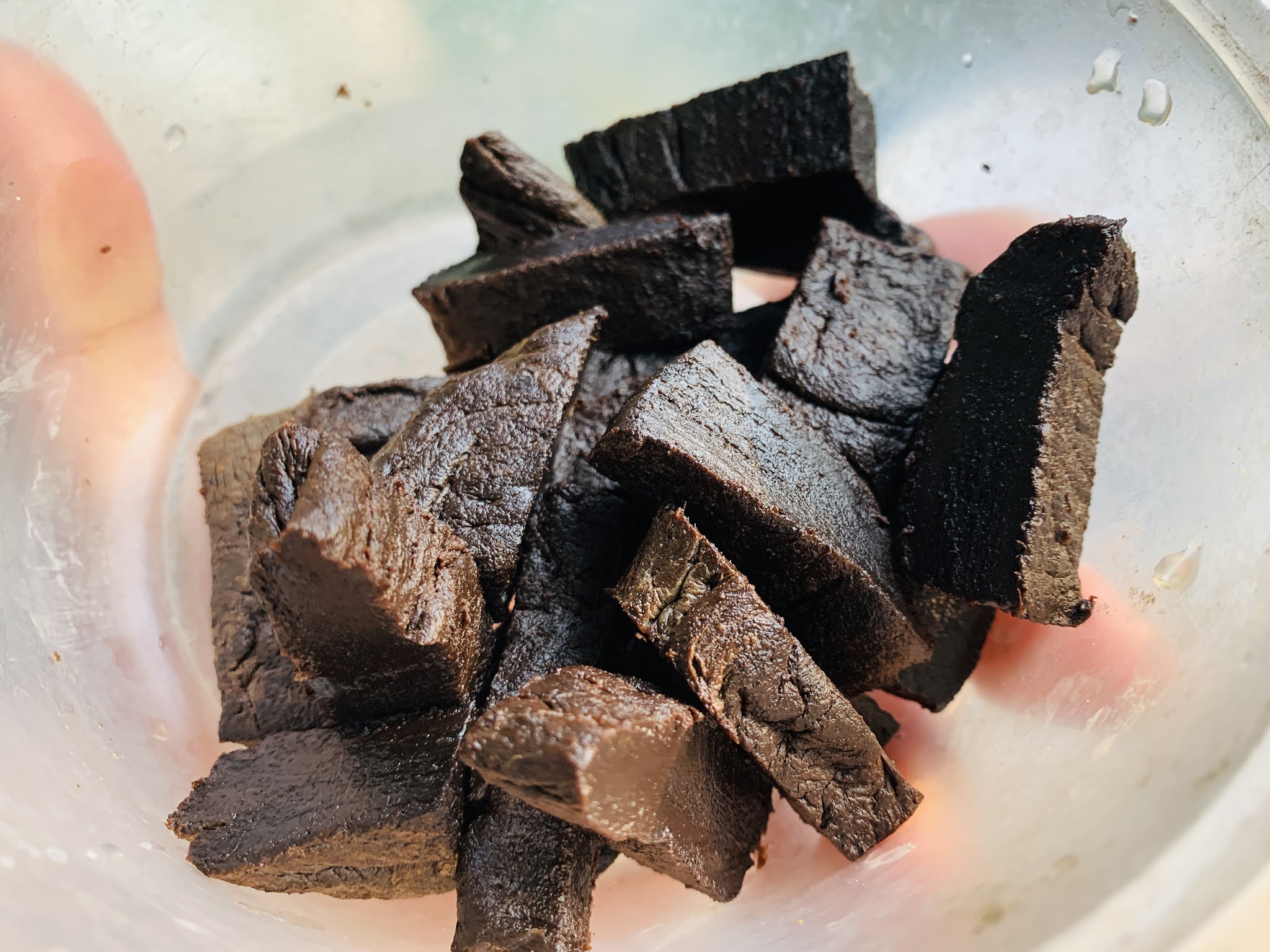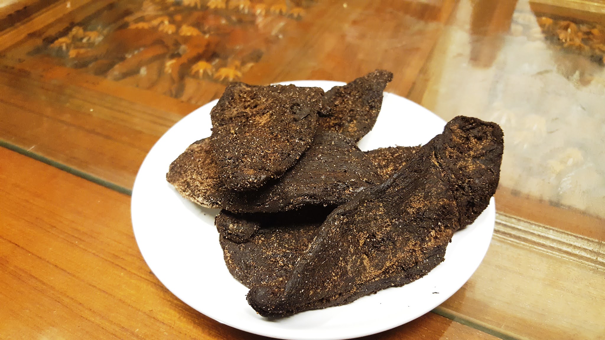 3. 內外顏色相近,甚至有些品項肉的顏色還比皮還深,如果切開內外顏色差很多,兩種可能,一種是染色的,一種是不夠老(10年內)。以前有見過用醬油染,味道上雖然聞不出來,但一煮下去就見真章了,顏色退到湯中,看菜脯明顯顏色就變淺了。